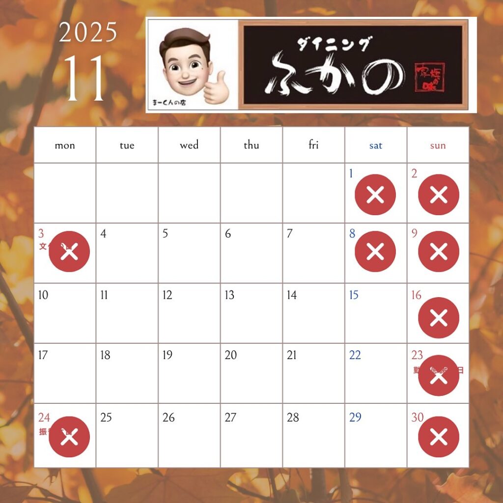 【宇部店】11月の営業日2025年11月01日 宇部店の11月の営業日です。土曜日の臨時休業が続いてしまい申し訳ありません🙇♀️💦今のところ❌以外は営業してますのでみなさまのご来店をお待ちしております☺️✨たくさんのご予約ありがとうございます。 Instagramで確認する「カフェ&ダイニング ふかの」では、SNSでも積極的に情報発信を行なっております。「いいね」や「フォロー」をよろしくお願いします!お知らせ一覧へ