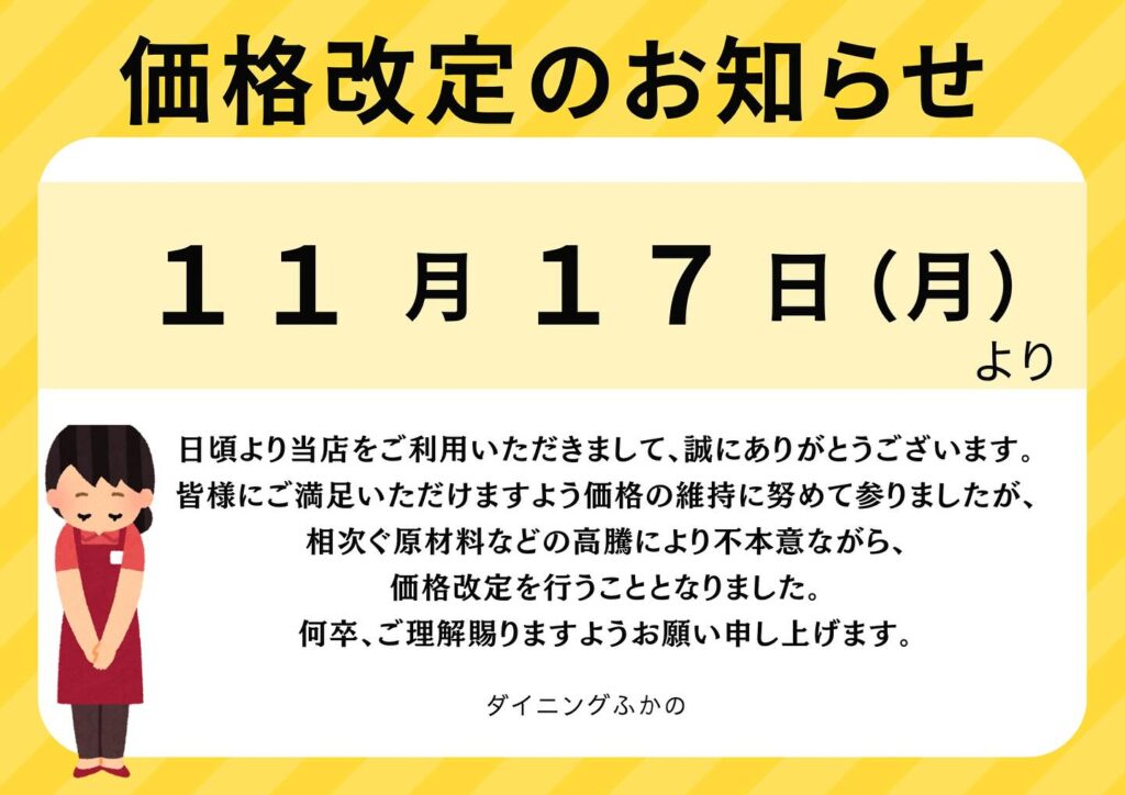 店内メニューの価格改定のお知らせ