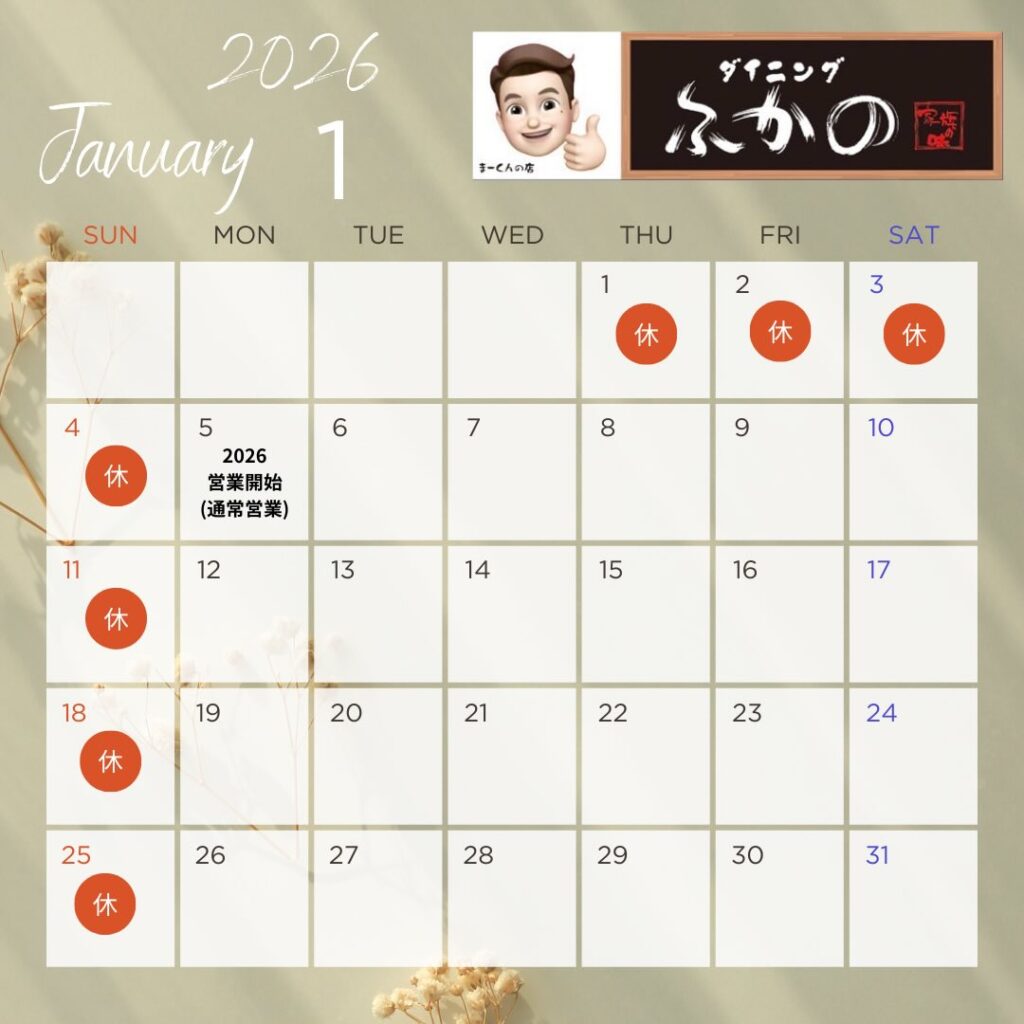 【宇部店】1月の営業日2026年01月01日 あけましておめでとうございます✨🎍🐴2026年もダイニングふかのをよろしくお願いいたします🌸さっそく新年早々ご予約ありがとうございました😊👍宇部店の営業日カレンダーです✨(変更になる場合があります💦)今年もよろしくお願いいたします🥰 Instagramで確認する「カフェ&ダイニング ふかの」では、SNSでも積極的に情報発信を行なっております。「いいね」や「フォロー」をよろしくお願いします!お知らせ一覧へ