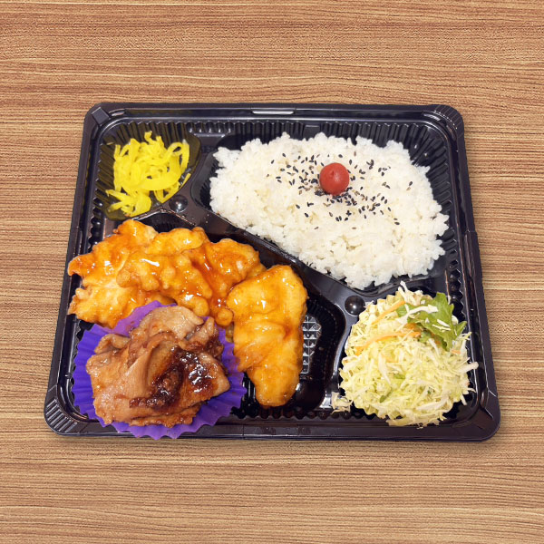 スタミナ満点!ガッツリ食べたいあなたにオススメです。特製のタレで焼き上げた生姜焼きと甘酢餡が絡んだとり天でご飯が進むこと間違いなし!彩り豊かな副菜も入って栄養満点。このお弁当で午後も元気に乗り切りましょう。宇部店限定です。